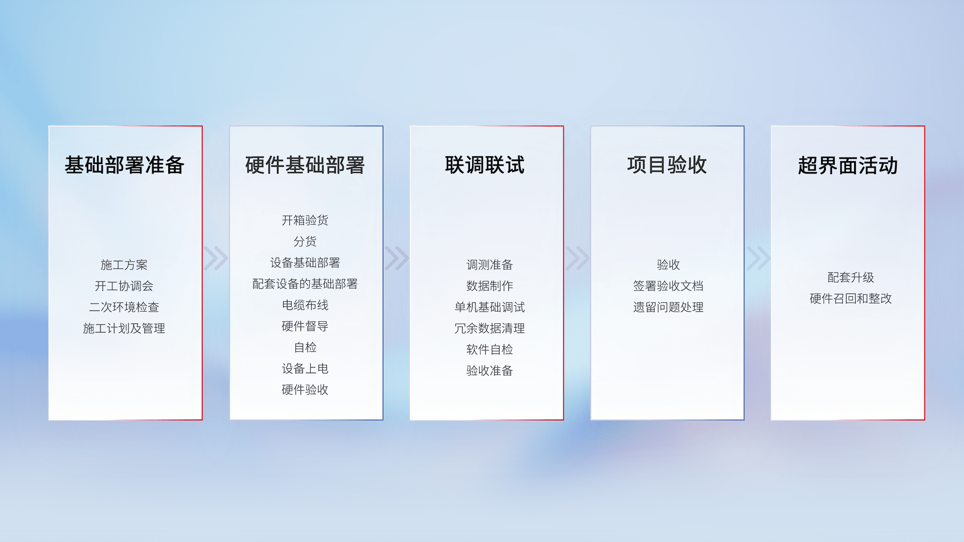从基础部署准备、、、、硬件基础部署、、、联调联试、、、、项目验收、、、、越界面活动的全过程可追溯,,,保证施工质量和进度。。。。